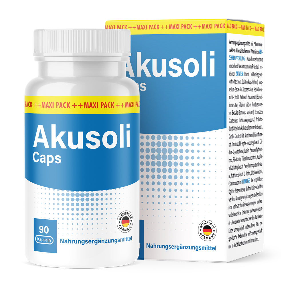 Weiße Kunststoffdose mit blauem Etikett Akusoli Caps 90 Kapseln vor passender Faltschachtel mit Punktmuster